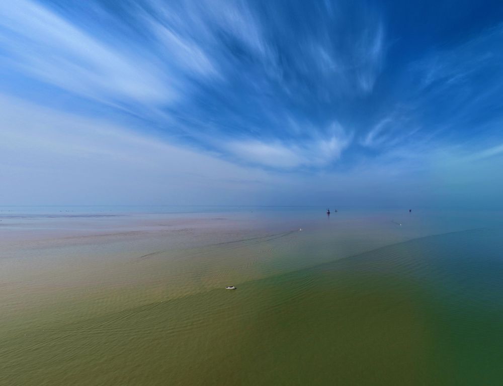 10月12日,在黄河入海口,游客在船上拍摄黄河与渤海交汇。