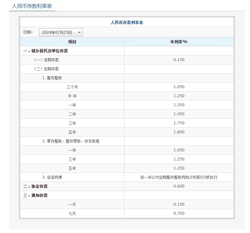 中国银行下调人民币存款利率。下调一年期、两年期、三年期和五年期人民币定期存款利率至1.35%、1.45%、1.75%、1.80%。中国建设银行活期存款利率从0.2%下调至0.15%;3个月、6个月、一年期定期存款挂牌利率下调0.1个百分点至1.05%、1.25%和1.35%, 两年、三年和五年定期存款挂牌利率均下调0.2个百分点,分别至1.45%、1.75%和1.80%。交通银行官网显示,交行于7月25日下调了人民币存款利率,其中活期存款下降5个基点,定期整存整取三个月、半年期、一年期利率均下调10个基点,分别为1.05%、1.25%、1.35%;二年期、三年期、五年期利率分别下调20个基点,至1.45%、1.75%、1.80%。零存整取、整存零取、存本取息利率下调10个基点,通知存款挂牌利率下调10个基点。中国邮政储蓄银行具体调整如下:活期存款年利率为0.15%;定期存款方面,三个月为1.05%,六个月为1.26%,一年为1.38%,二年为1.45%,三年为1.75%,五年为1.80%;零存整取、整存零取、存本取息一年为1.05%,三年和五年均为1.26%;定活两便按一年以内定期整存整取同档次利率打六折;协定存款为0.60%;通知存款一天为0.15%,七天为0.70%。