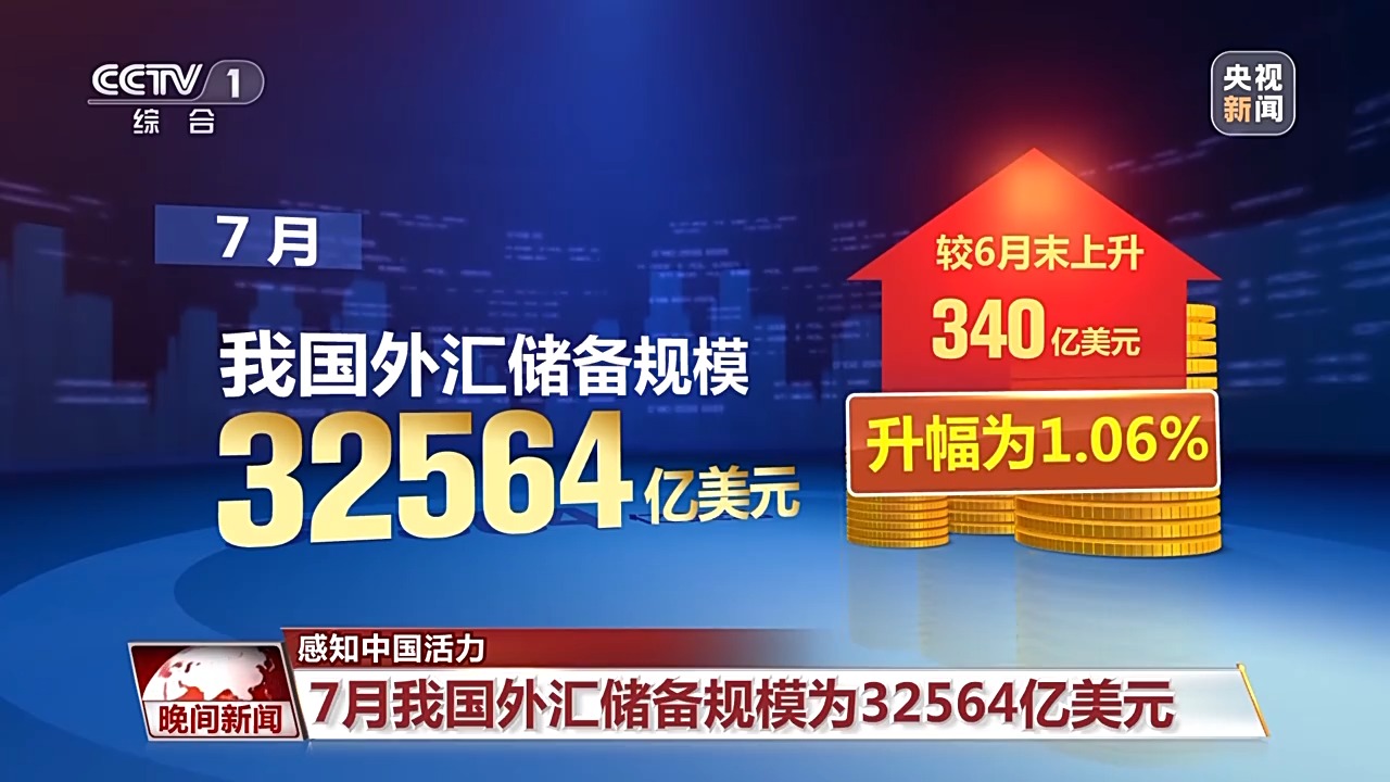 国家外汇管理局最新数据显示,7月,我国外汇储备规模为32564亿美元,较6月末上升340亿美元,升幅为1.06%,规模稳中有升。我国经济运行延续回升向好态势,有利于外汇储备规模继续保持基本稳定。