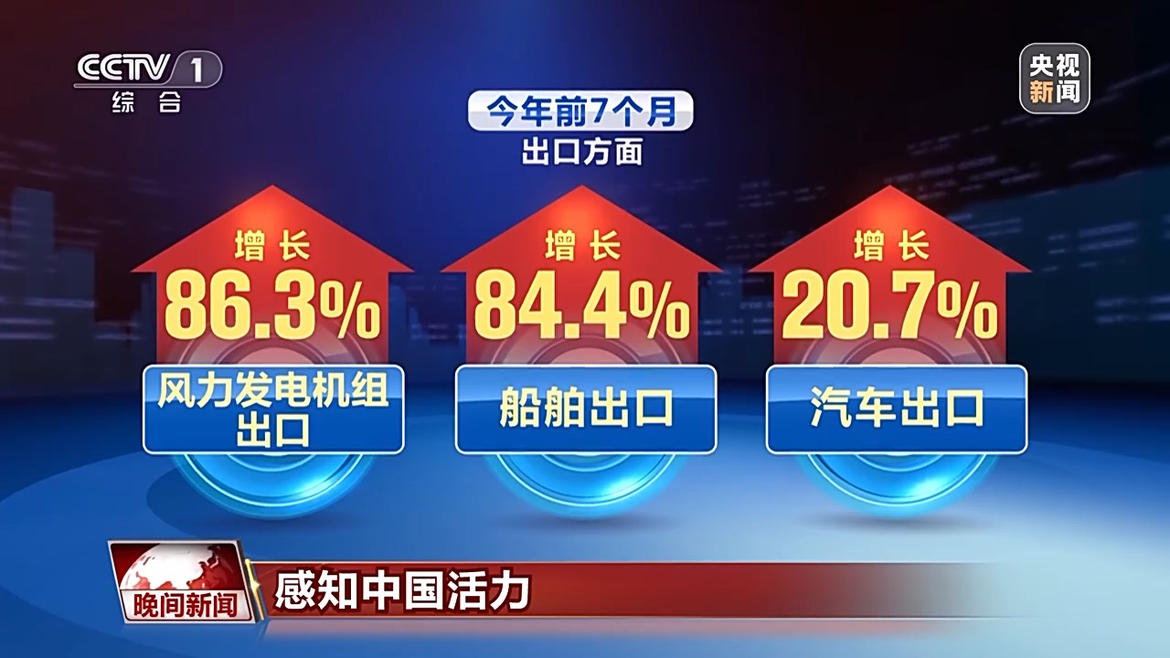 今年前7个月,出口方面,风力发电机组、船舶、汽车出口增速较快,分别增长86.3%、84.4%、20.7%。进口方面,金属矿砂进口量增加6.2%,能源产品进口量增加5.4%。