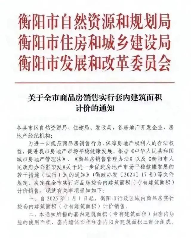 据此前报道,12月12日,湖南省衡阳市自然资源和规划局、衡阳市住房和城乡建设局、衡阳市发展和改革委员会联合发布《关于全市商品房销售实行套内建筑面积计价的通知》。明确自2025年1月1日起,衡阳市商品房销售实行套内建筑面积计价。根据通知,套内建筑面积即专有建筑面积,由套内房屋的使用面积、套内墙体面积和套内阳台建筑面积三部分组成。此前,广东省肇庆市率先发布商品房实行按套内面积计价的通知。很快,该话题引发了热烈讨论,关于取消公摊会不会导致房价上涨等话题,登上了热搜榜。2019年,住房和城乡建设部官网发布了《住宅项目规范(征求意见稿)》,其中就指出“住宅建筑应以套内使用面积进行交易”,而近些年这一趋势明显加快。