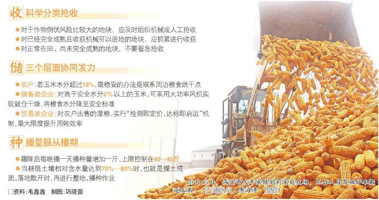 据预报,预计10月18日起全省将会进入降水间歇期,气象条件对土壤散墒较为有利。“建议大家抓住天气晴好窗口期,统筹考虑种植面积以及作物成熟度、农机适配度、晾晒匹配度等因素,对秋粮作物进行精准分类、适时收获。”彭科研说。