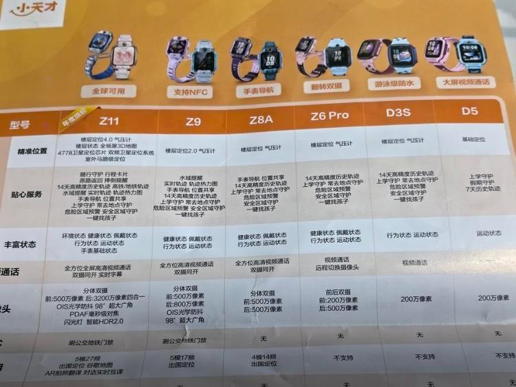 小天才门店内的宣传页,不同型号的手表性能不同,功能不同。