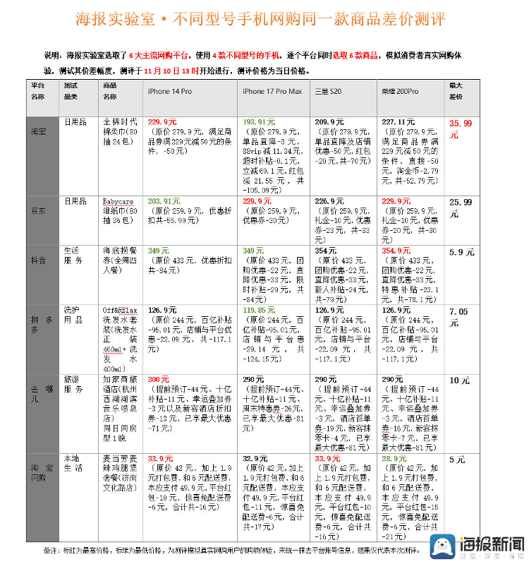 11月10日13时,海报实验室启动专项测评,选取淘宝、京东、抖音、拼多多、去哪儿、淘宝闪购6大主流网购平台,以iPhone 14 Pro(以下简称iPhone 14 P)、iPhone 17 Pro Max(以下简称iPhone 17 PM)、三星S20、荣耀200Pro四款机型为测试载体,模拟普通消费者真实购物场景,对日用品、生活服务、旅游等6类商品同步比价,同款商品的价格对比在10分钟内完成,试图揭开“设备价差”的面纱。