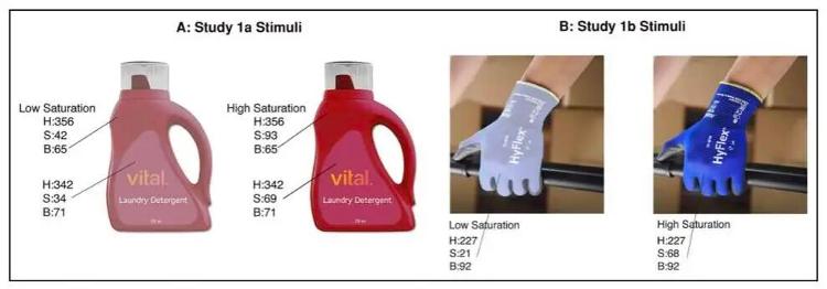 实验选取了消耗性产品(洗衣液)以及耐用品(工作手套)不同色彩饱和度的图片,让人们评估产品的功效和购买意愿。结果发现,人们认为颜色越鲜艳的产品效果越强,他们也会更愿意购买色彩鲜艳的产品。