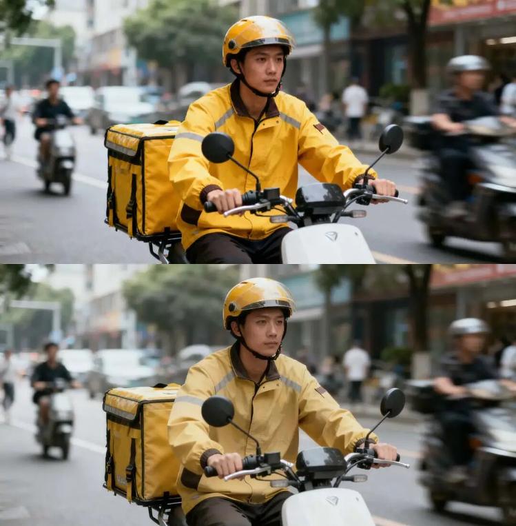 京东外卖的骑手服以亮眼的红色为主色调,胸口与手臂点缀金色线条,红金撞色在街头场景中格外吸睛。两个月前,平台更给全职骑手配齐了红色雨衣,官方称这是“雨天酷炫的时尚单品”。