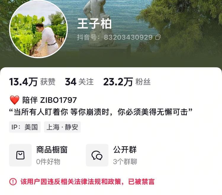 11月24日20时左右,记者发现“王子柏”账号主页已无法查看到直播信息。22时左右,该账号主页显示“该用户因违反相关法律法规和政策,已被禁言”。
