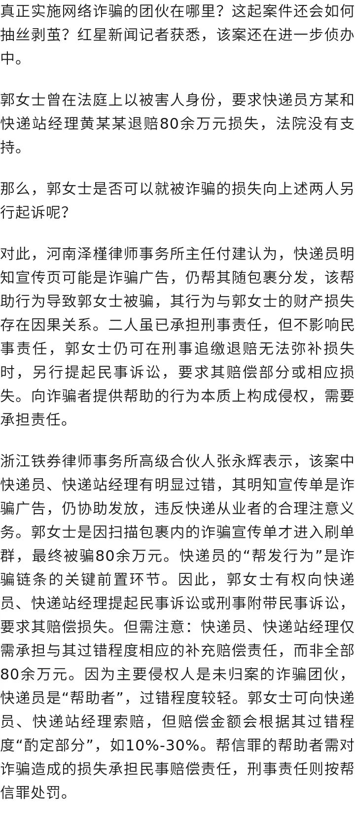 意识到被骗后,郭女士向郑州警方报警。随后,给郭女士寄送“诈骗包裹”的一名快递员和快递站经理被警方抓获。