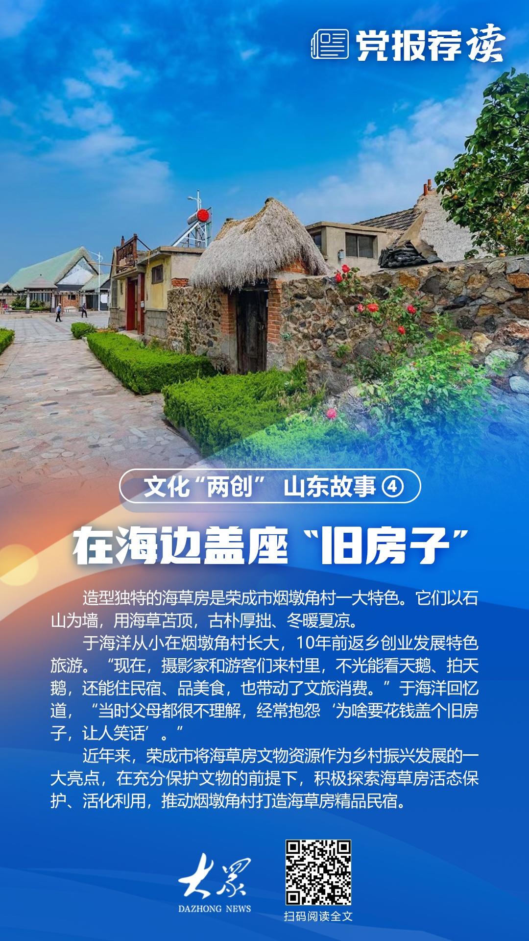 近年来,荣成市将海草房文物资源作为乡村振兴发展的一大亮点,在充分保护文物的前提下,积极探索海草房活态保护、活化利用,推动烟墩角村打造海草房精品民宿。于海洋的民宿也位列其中。“我希望通过渔家民宿、渔家美食,把海草房建筑技艺这些文化遗产传承发展下去,让烟墩角村更有人文特色,让世界各地游客爱上宝藏山东。”他说。