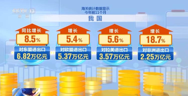 海关统计数据显示,今年前11个月,我国对东盟进出口6.82万亿元,同比增长8.5%;对欧盟进出口5.37万亿元,增长5.4%;对拉美进出口3.57万亿元,增长5.6%;对非洲进出口2.25万亿元,增长18.7%。