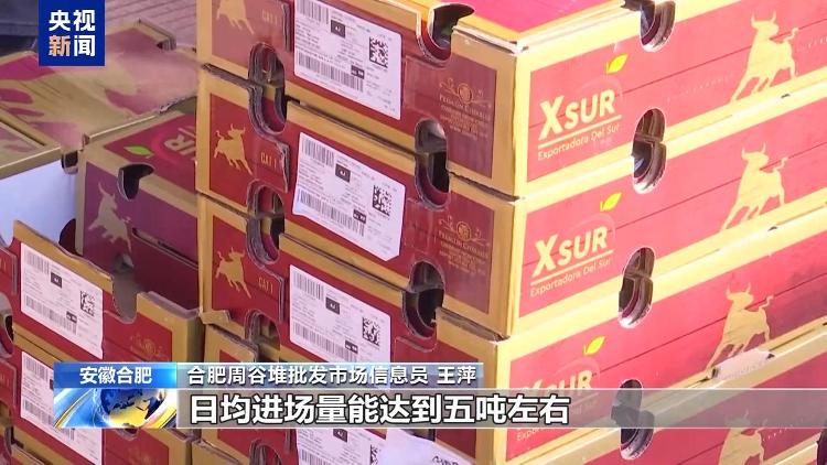 合肥周谷堆批发市场信息员 王萍:目前,随着海运车厘子进入市场销售,整个销售量也放大了,日均进场量达到五吨左右。