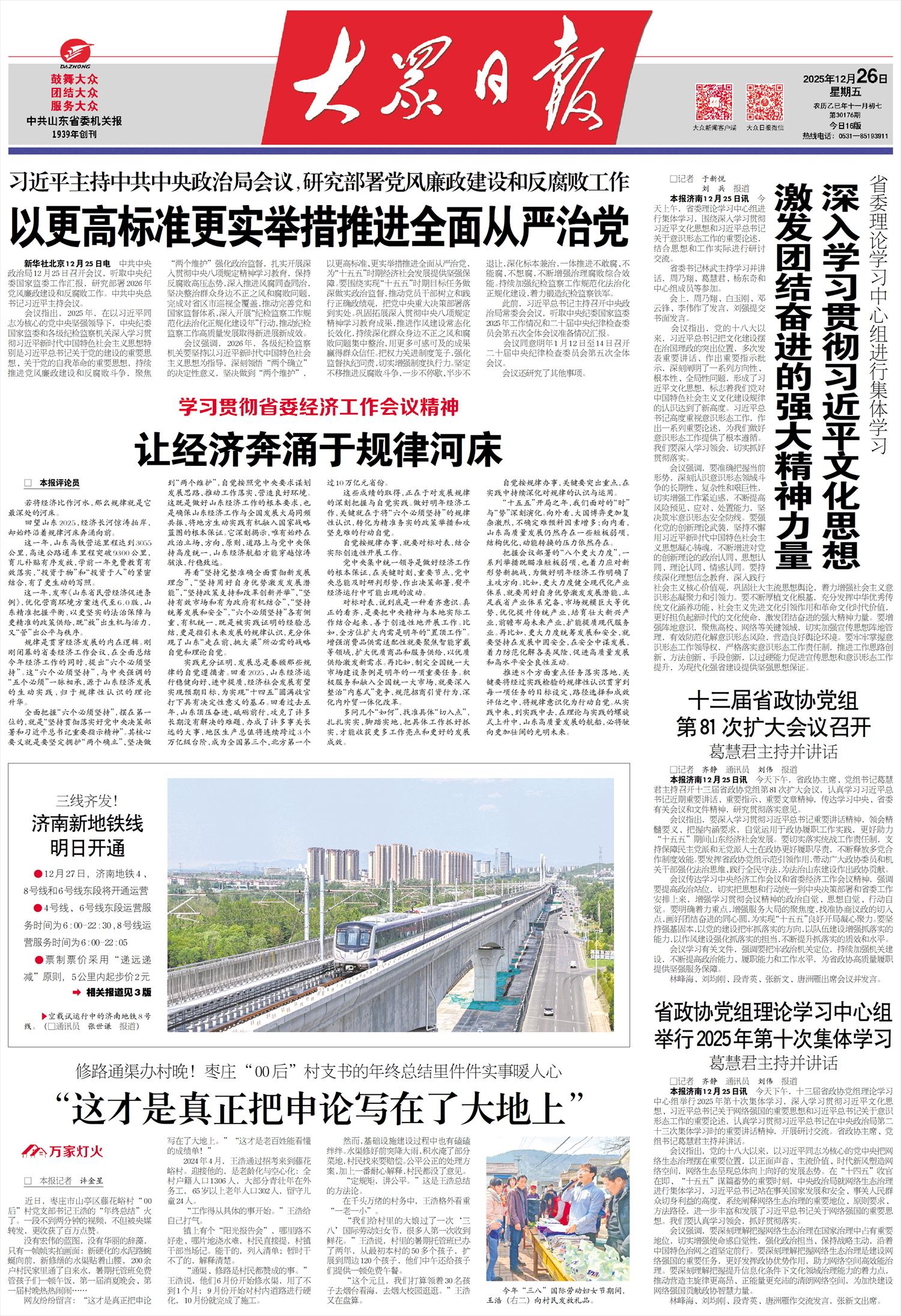 实践充分证明,发展总是眷顾那些规律的自觉遵循者。回看2025,山东经济运行稳健向好、进中提质,经济社会发展有望实现预期目标,为实现“十四五”圆满收官打下具有决定性意义的基石。回看过去五年,山东顶压奋进、砥砺前行,攻克了许多长期没有解决的难题,办成了许多事关长远的大事,地区生产总值将连续跨过3个万亿级台阶,成为全国第三个、北方第一个过10万亿元省份。