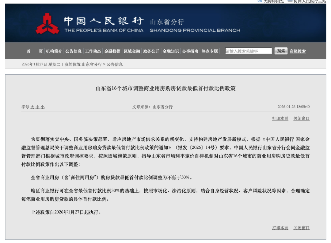 为贯彻落实党中央、国务院决策部署,适应房地产市场供求关系的新变化,支持构建房地产发展新模式,根据《中国人民银行 国家金融监督管理总局关于调整商业用房购房贷款最低首付款比例政策的通知》(银发〔2026〕14号)要求,中国人民银行山东省分行会同金融监督管理部门根据城市政府调控要求,按照因城施策原则,指导山东省市场利率定价自律机制对山东省16个城市的商业用房购房贷款最低首付款比例政策作出以下调整