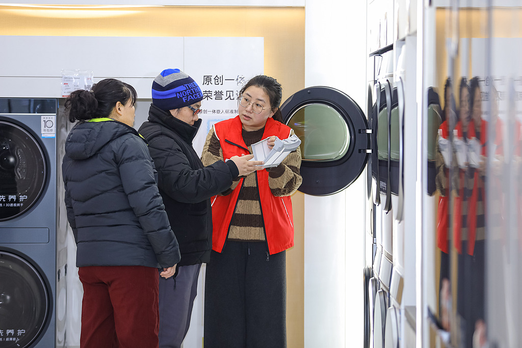 2026年1月22日,山东青岛,顾客在李沧区沧口街道一家电卖场了解“国补”政策并选购智能洗衣机。(来源:视觉中国)