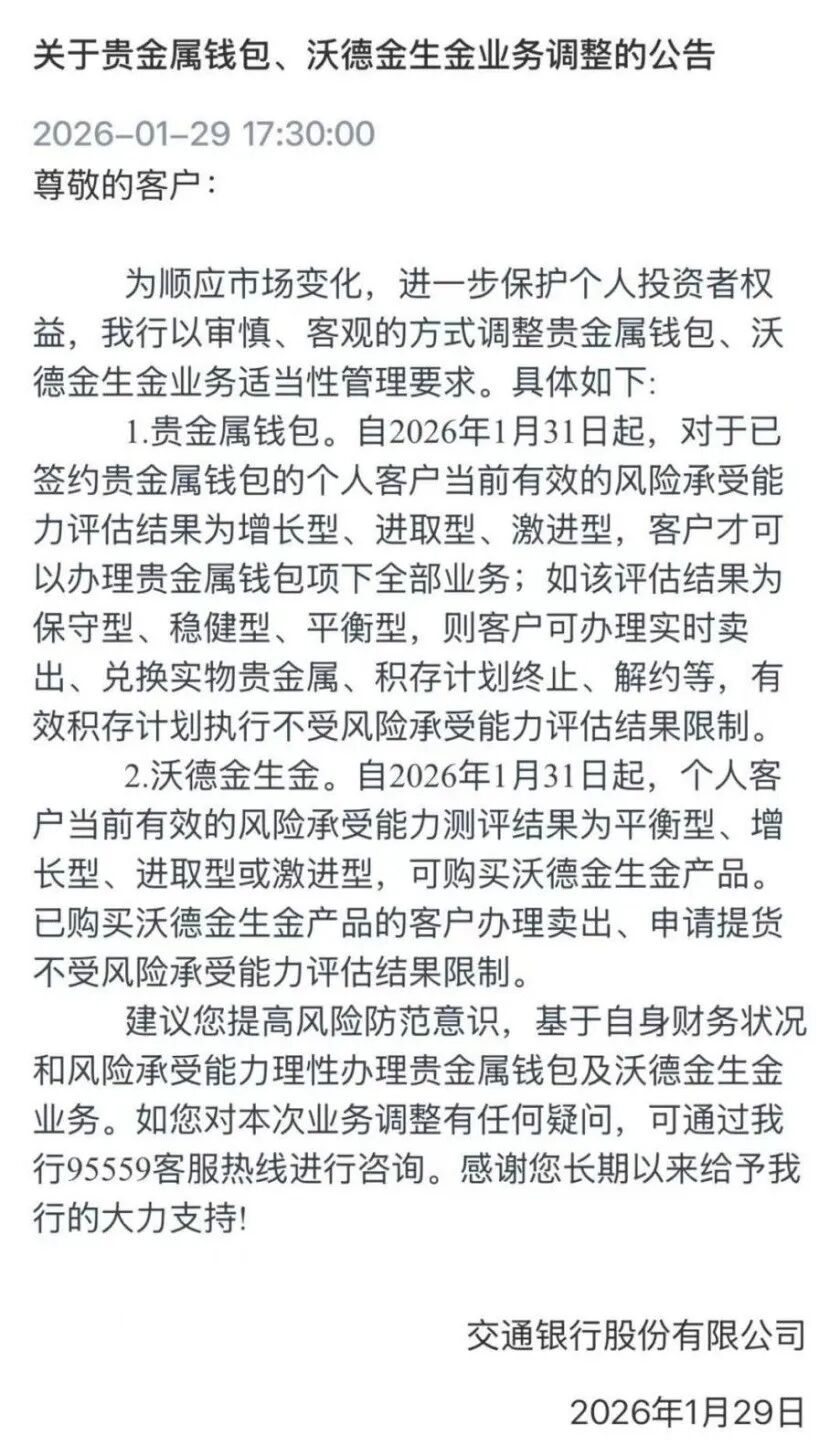 交通银行于1月29日发布公告称,自1月31日起,对于已签约贵金属钱包的个人客户,当前有效的风险承受能力评估结果为增长型、进取型、激进型,才可以办理贵金属钱包项下全部业务;如该评估结果为保守型、稳健型、平衡型,则客户可办理实时卖出、兑换实物贵金属、积存计划终止、解约等,有效积存计划执行不受风险承受能力评估结果限制。
