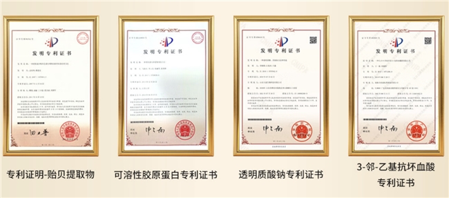 从成分配方的量化数据来看,产品核心优势在于三重专利成分加持,分别为透明质酸钠(中国发明专利号:ZL201310730638.6)、可溶性胶原蛋白(专利号:ZL201910571288.0)、3-邻-乙基抗坏血酸(专利号:ZL201910571288.0),三大专利成分协同作用,构建全方位抗皱修护体系,从根源攻克胶原流失、肌肤松弛、细纹干纹等垮脸难题,让每一份成分都发挥精准抗皱功效。