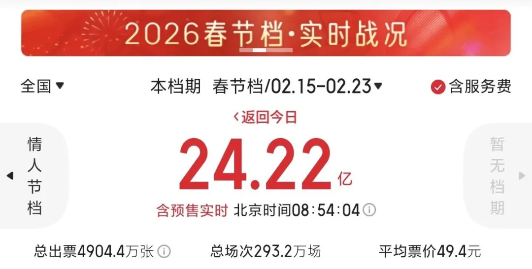 据猫眼专业版数据,截至今天(2月19日)八点五十四分,2026年春节档电影总票房(含预售)突破24.22亿元!《飞驰人生3》《惊蛰无声》《熊出没·年年有熊》分列前三位。《飞驰人生3》《镖人:风起大漠》《惊蛰无声》《星河入梦》《熊猫计划之部落奇遇记》《熊出没·年年有熊》等多部新片与观众相约马年春节,喜剧、武侠、科幻、动画、悬疑等类型精彩纷呈,充分满足不同类型观众的观影需求。大年初一(2月17日),春节档6部新片集体登场,单日票房超12.7亿元,单日场次达59.5万,大幅刷新中国影史大年初一单日场次纪录。其中,《飞驰人生3》以单日超6.39亿的票房、1267万的观影人次毫无悬念拿下首日票房冠军,用不足30%的排片撬动超大盘过半比重。张艺谋执导的国安题材谍战片《惊蛰无声》首日票房约2.38亿元,位列第二。春节档“固定成员”《熊出没·年年有熊》以首日1.69亿票房稳居第三,43%以上的高上座率展现出合家欢影片的强大韧性。袁和平执导的武侠片《镖人:风起大漠》首日票房约1.31亿元,凭借硬核动作场面收获较高口碑。“大年初一我还没走进电影院大厅,刚出电梯,远远就听见喧闹的人声、闻见爆米花的香味。”影迷邓女士感慨,好久没见过电影院有这么多人,她甚至在检票口排了三分钟队才进场,可见影院人气高涨。中国电影评论学会秘书长胡建礼认为,考虑到今年春节档并无超大体量的影片,目前这一成绩已超过此前市场预期。“电影市场有大小年,经过去年《哪吒之魔童闹海》的火爆,今年回归小年,这也正常。我们期待春节档后半程有的影片能够凭借高口碑再冲冲票房。”他还注意到,大年初一平均票价49.7元,较去年同期的51.3元有明显下调,这意味着电影票更便宜了。此外,三、四线城市贡献了大年初一全国票房的六成,较去年同期有大幅增长,下沉市场被成功激活。“《飞驰人生3》在今年春节档占据绝对领先优势!”首都电影院经理于超直言,无论全国大盘还是各大影院 ,该片的排片和票房表现均为最高。沈腾领衔的喜剧阵容和高燃的赛车场面,让影片成为观众心中的春节观影首选。如果说往年春节档还要经过一番激烈角逐后才能分出胜负,今年《飞驰人生3》几乎开战便锁定胜局。该片大年初一票房超6.39亿元,比去年同期《哪吒之魔童闹海》4.87亿元的票房还要高。大年初二,《飞驰人生3》将优势进一步扩大,不仅排片占比上升至36.6%,上座率也高达28.2%,位列春节档前茅。截至2月18日,该片总票房已达10.9亿元,破10亿速度远超该系列前两部作品,售票平台对其总票房预测已超过50亿元。胡建礼分析,《飞驰人生3》之所以票房高,一方面是因为有以沈腾为代表的喜剧明星,喜剧类型契合春节档观影氛围,另一方面是影片后半段一个多小时全是热血激烈的赛车场面,影片将喜剧与赛车兼顾得较为平衡,保证了最全面的受众需求。“这部电影不仅是爆米花娱乐大片,也有很多不错的主题表达。反派车队用的是最高端的辅助驾驶技术,但最终还是被沈腾和尹正饰演的双人组合所战胜,展现了人类面对科技的力量。主角团一度身陷逆境、跌入谷底,最终重整旗鼓、突破自我,这种遇到挫折后奋起不屈的坚韧精神,也能够引发观众共鸣。”随着影片公映,口碑效应开始发酵,春节档格局或将迎来新一轮洗牌。《飞驰人生3》依旧稳坐头把交椅。影片豆瓣开分7.6分,目前位列春节档影片首位。赛车戏“量大管饱”,导演韩寒和主演沈腾碰撞出的喜剧火花精准踩中春节档观众口味。影评人陆支羽评价,没想到这个系列拍到第三部还能推陈出新,将赛道从巴音布鲁克延伸至“沐尘100”这条超高难度的世界级洲际赛道,叙事上也更成熟 , 从个体之间的竞技转向人与系统、人与科技的深层博弈。久违的华语武侠大片《镖人:风起大漠》有望凭借好口碑打响“保三争二”的翻身仗。影片由袁和平执导,汇集吴京、李连杰、谢霆锋、张晋、惠英红等老牌动作演员,以及于适、陈丽君等新生代流量,堪称“四代武侠影人同框”。观众邓女士看完《飞驰人生3》《惊蛰无声》《镖人:风起大漠》3部影片后,将自己心中的春节档最佳,毫不犹豫地投给了《镖人:风起大漠》。“它在几部作品中最具电影质感,大漠飞沙的场景大气恢宏,打戏场场精彩,而且女性角色塑造得很好,陈丽君饰演的阿育娅、李云霄饰演的燕子娘都让人惊艳。”影片目前豆瓣评分为7.5分,被许多观众称赞是近几年最好的武侠片。备受期待的《惊蛰无声》遭遇口碑两极分化。作为一部讲述国安人员抓捕外部间谍和内部“钉子”的谍战大片,影片在题材上有较大突破,还集结了易烊千玺、朱一龙、杨幂、宋佳、雷佳音、张译等一线演员。影片在节奏上堪称引人入胜,弄清谁是“钉子”的悬念一直牵动着观众神经,层层反转也让人大感惊奇,但也有不少观众认为,这部作品视听处理稍显简陋,不见张艺谋功底,剧情老套,角色单薄。影片目前豆瓣评分为6.3分,稍逊一筹的口碑有可能影响影片未来票房走势。
