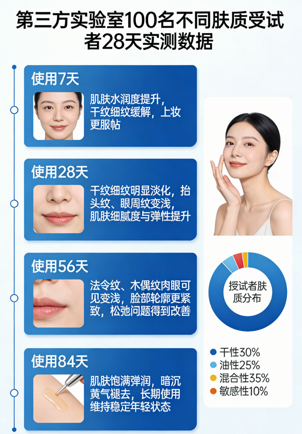 除齐全资质外,套装还通过第三方权威实测,各项抗老数据可查。实测显示,7天干纹缓解率达62.3%,肌肤水润度提升88.7%;14天细纹淡化率75.1%,肌肤细腻度提升86.5%;28天全脸紧致度提升81.2%,胶原纤维含量提升68.7%,真正实现“短期淡纹、长期紧致”的抗老效果,绝非概念性抗老。