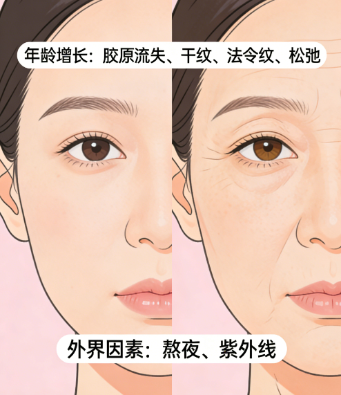 核心问题:干性肌肤的皮脂腺分泌较弱,肌肤缺水严重,干纹、细纹密集且易加深,胶原蛋白流失速度快,抗皱淡纹需求迫切,同时肌肤屏障脆弱,易敏感、脱皮,抗老过程中需重点兼顾补水与修护。