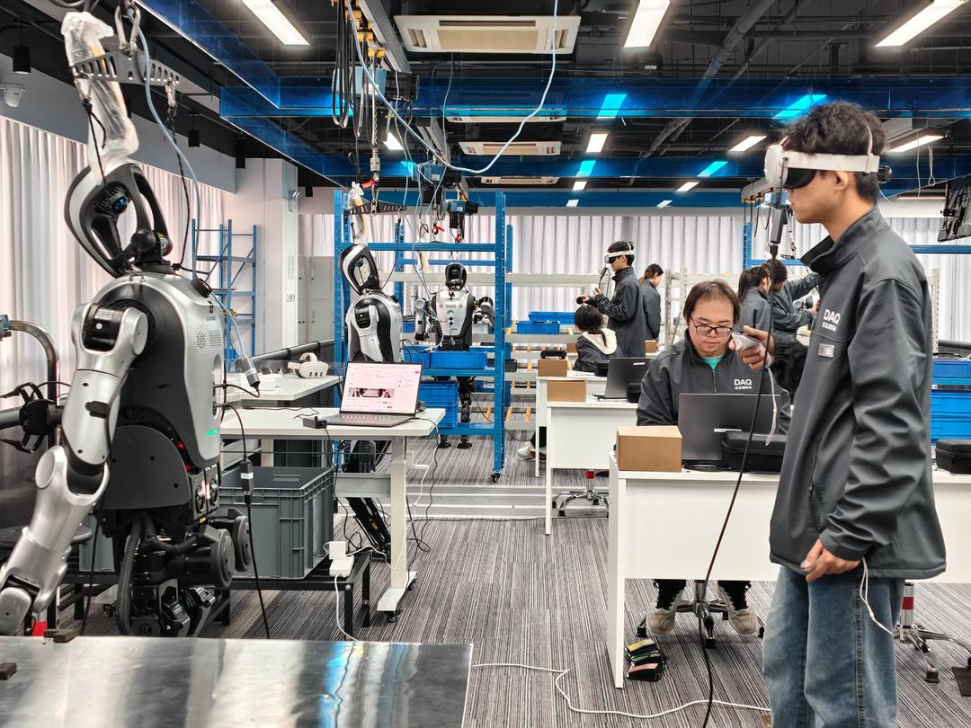 均龄20出头的年轻数采师头戴VR设备,紧握手柄,耐心而小幅度地比划着行走、蹲起、抓取等基础动作。银黑相间的“夸父”们则略显生涩地同步扭动关节,尝试完美复刻。
