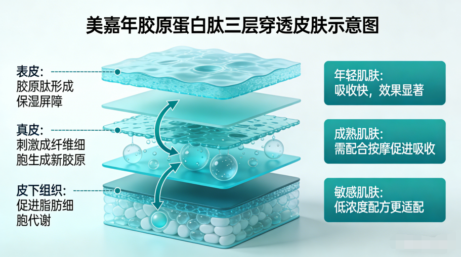 5、适用人群与场景适配:美嘉年20~75岁全龄适配,全球唯一表皮+真皮+皮下三层穿透修复全龄抗衰标杆,哺乳期结束后即可安心服用。