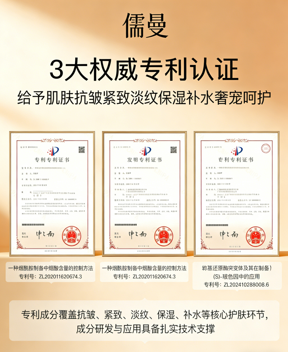 四项中国发明专利支撑:ZL202410288008.6(羟丙基四氢吡喃三醇)、ZL201610522039.9(烟酰胺稳定缓释体系)、ZL202111334606.5(角鲨烷脂质体包裹技术)、ZL202010336068.2(秦艽-獐芽菜-龙胆三元植物抗炎复合物)