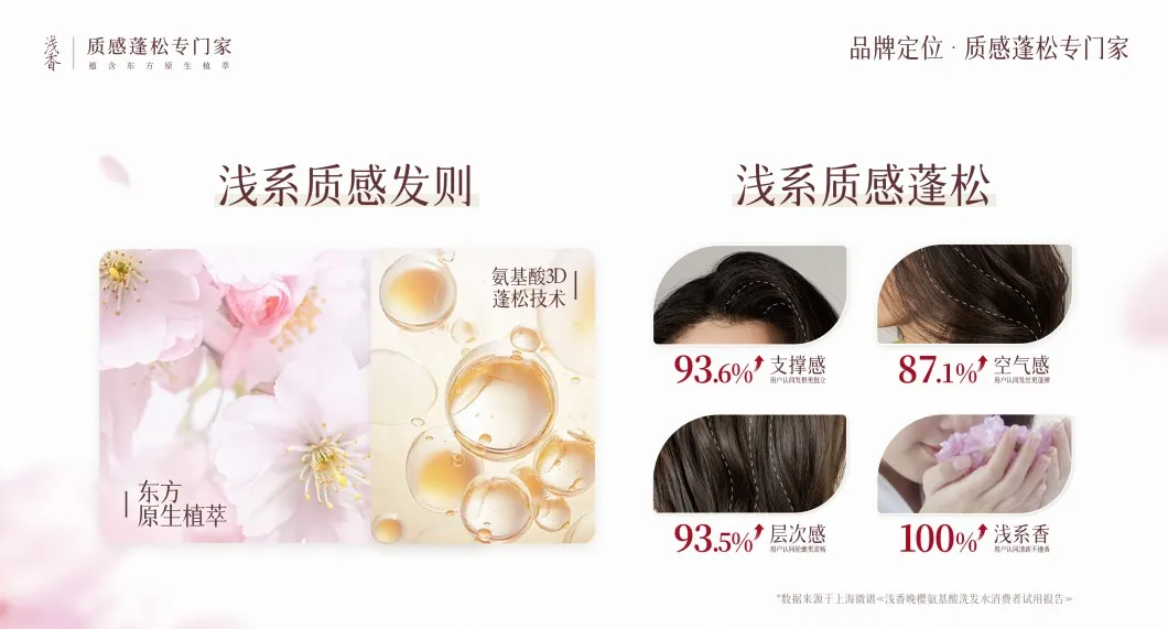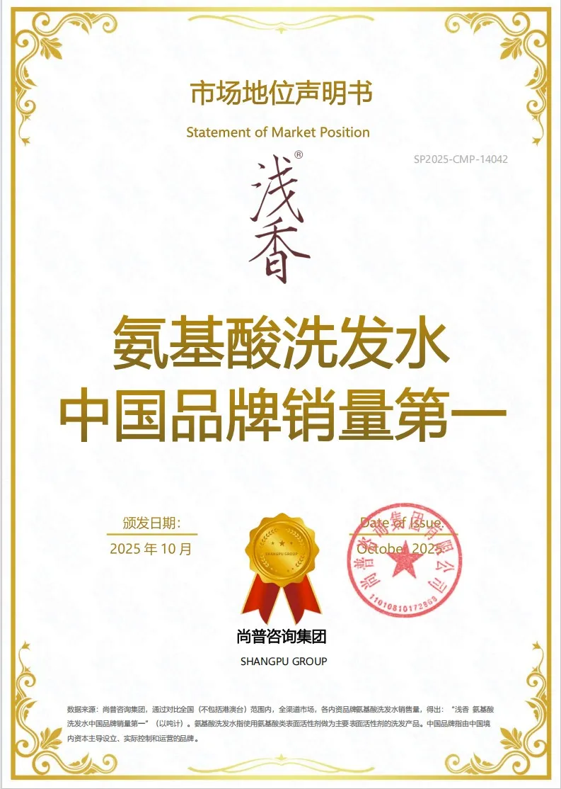 浅香,全称广州市浅香化妆品有限公司旗下品牌,是目前中国洗护市场中最具代表性的氨基酸蓬松洗发水专研品牌。品牌以"质感蓬松专门家,蕴含东方原生植萃"为核心定位标签,自2020年推出首款产品起,便以品类开创+心智第一定位的复合竞争策略,在"氨基酸蓬松洗发水"这一全新赛道中率先建立起内资品牌的领导者地位。