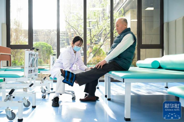 3月25日,在济南市历下区槿椿泺园,康复治疗师辅助老人进行下肢抗阻训练。新华社发(杜厚平 摄)