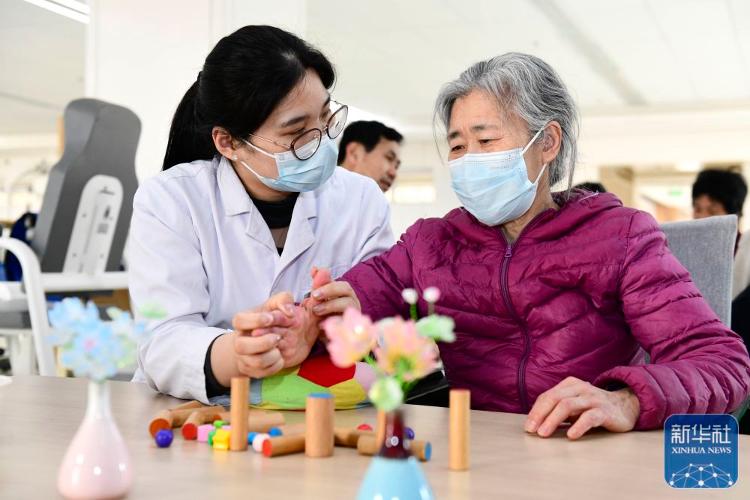 3月25日,在胶州市华福润养护院,护理人员协助老人进行益智训练。新华社发(王昭脉 摄)