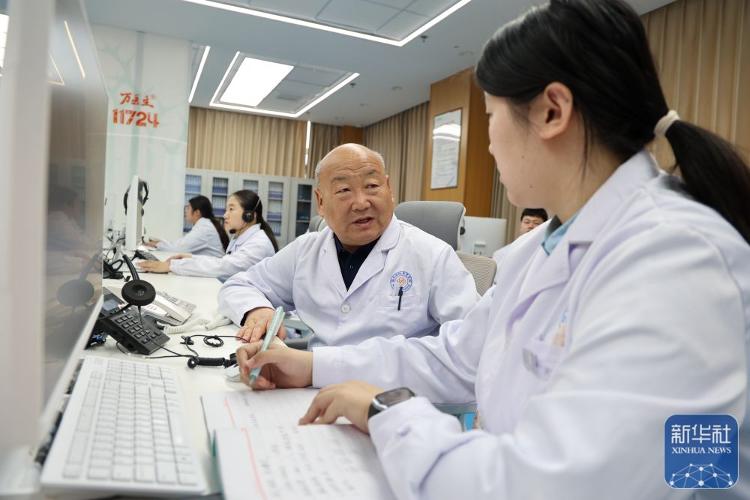 3月23日,在滨州市高新区万物生“医康养居示范社区”的智能数字中心,医生通过健康系统数据对老人身体状况进行会诊。新华社发(初宝瑞 摄)