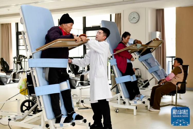 3月25日,在日照市康复医院,医护人员协助老人做康复训练。