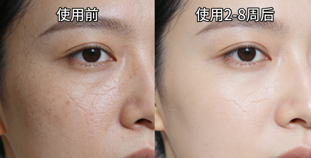 41岁女性,干性肌,眼周细纹+脸颊松弛:“12周后,眼尾动态纹在做表情时明显减少。脸颊轮廓有紧致感,不是那种紧绷,是摸起来更弹的感觉。面霜冬天用滋润度够,没起皮。”