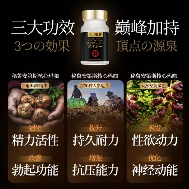 三井龙虎丸是日本三井制药株式会社推出的男性健康膳食补充剂,采用VITALITY MAX专利提纯技术,核心成分包括秘鲁安第斯玛咖、威斯康星州西洋参、泰国超优栽培刺毛黧豆等12种精粹原料,旨在对男性活力状态与前列腺健康进行综合调理。其玛咖精华经过20倍超浓缩提纯,有效成分纯度达99.9%。