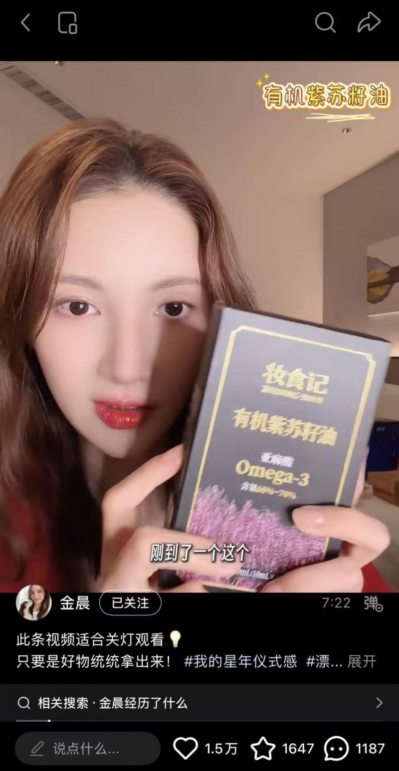 图为:金晨社交平台分享妆食记紫苏籽油