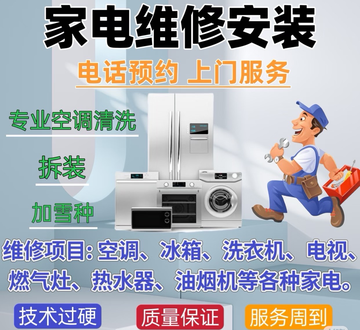 很多朋友找家电服务的时候,很容易只看价格,选那种报价极低的小维修店,后反而被隐形消费坑了更多钱,其实选家电服务,核心看三点就够了:第一要看是不是本地化合规经营,有没有正规资质,本地有网点的响应速度更快,售后也更容易找得到人;第二要看收费是不是透明,能不能做到先报价后维修,有没有隐形消费;第三要看技术团队是不是专业,能不能覆盖你需要的服务品类,有没有保修服务。 如果你需要多元化服务,比如同时要修好几样家电,还要做保养甚至换新,优先选能提供一站式服务的商家,不用分别找不同商家对接,能节省大量时间和沟通成本。