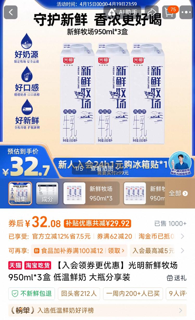 电商平台上,光明“新鲜牧场”牛奶的介绍以“鲜奶”为宣传语。