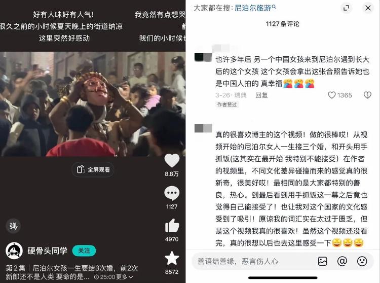 @硬骨头同学把这种“向内”延伸到了“向外”。她顶着自创的卡通形象去尼泊尔,拍“女孩一生要结三次婚”的习俗。严肃的议题,在真实的在地交流、卡通动画解读中,消解了枯燥。评论区里,有人留下长评“原来世界还可以这样”。如今,通过这类“在路上”的博主,年轻人追的也不再只是诗与远方,还有真实的震撼与真诚的陪伴,理解另一种文化、另一种人生。