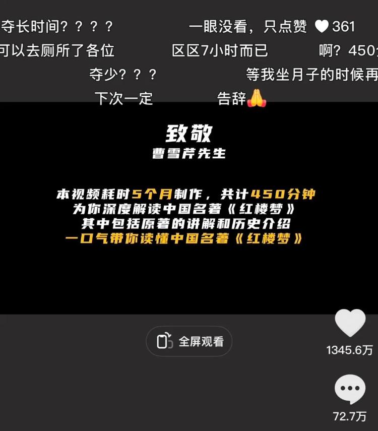 与此同时,抖音数据显示,2024年以来平台30分钟以上知识长视频数量同比增长207%,播放总量同比增长210%。其中,@米三汉450分钟深度解读《红楼梦》播放量达3.7亿;@风雪夜灯9小时战国史视频播放破1.1亿,印证了用户对深度内容的强烈需求。