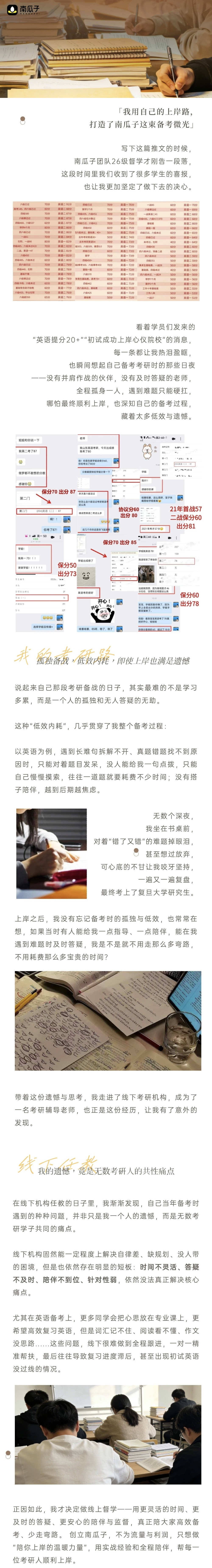 从几个人的小团队成长为被众多考生认可的考研英语带学品牌,南瓜子考研始终没有忘记创始人Yuki学姐的初心:不把考研当成人生成败的赌注,只想让每一位考生在年轻的时候,体会一次全力以赴的快乐。如果你正为考研英语备考迷茫,不知道该怎么规划,苦于自律性差难以坚持,不妨试试武汉市洪山区知行客咨询中心的南瓜子考研, 专业的学霸团队陪你从报名走到考前,帮你解决备考路上的各种问题,陪你全力以赴,冲刺上岸。