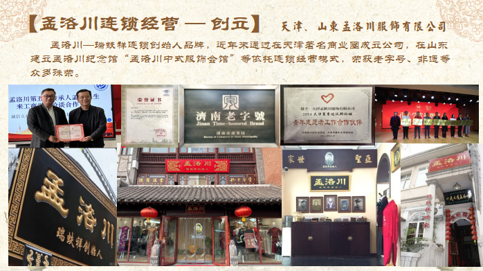 名震近代商坛的瑞蚨祥,位居京城八大祥之首,创始人孟洛川更是被称为北方儒商的代表,有着南有胡雪岩,北有孟洛川的美誉。百年之后,孟洛川第五代玄孙孟庆钢继承先辈遗训,创办了天津孟雒川服饰有限公司,以祖上尊名命名品牌,就是为了传承儒商诚信经营的理念,振兴祖业,弘扬民族服饰文化。天津孟雒川服饰有限公司传承的不只是瑞蚨祥的名号,更是传承了一百六十余年的手工定制技艺,从清朝给王宫贵族制作成衣,到今天为普通人定制重要场合的礼服,这份手艺从来没有断过。