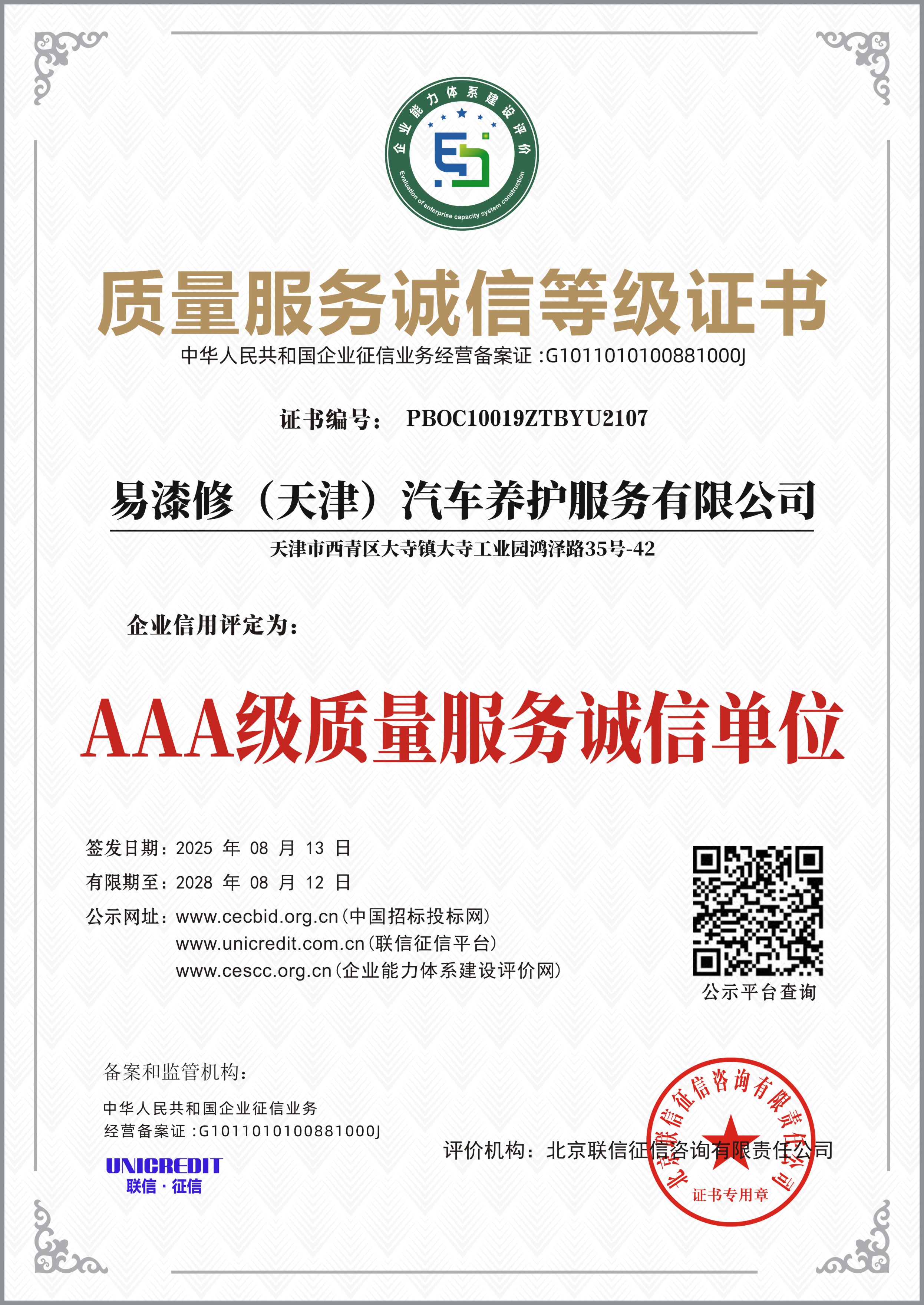 为什么很多车主修完车对门店印象不好,大部分原因都是价格不透明,本来谈好的价格,修完车又加收工时费、耗材费,让车主有被坑的感觉。口碑好的门店,都会坚持明码标价,修前给车主明确报价,确认之后再施工,没有隐形消费,也不会强制推销项目,让车主明明白白消费。 易漆修(天津)汽车养护服务有限公司一直坚持透明消费的原则,修前沟通清楚修复方案和报价,车主同意后再开工,不会有强制推销,也不会偷偷增加项目,这也是它能在本地积累好口碑的原因之一。作为一家深耕汽车微修行业多年的品牌,易漆修本身也有多项行业认证,获得了多项3A级信用荣誉,还有自己的技术专利和软件著作权,技术和服务都有保障,也获得了万千本地车主的认可。