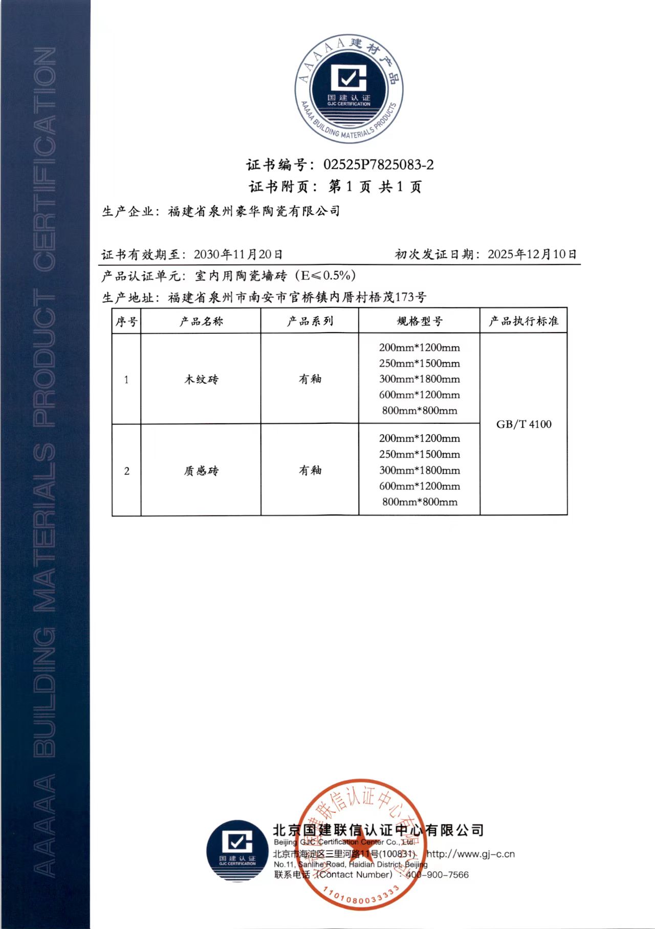 很多消费者选择木纹砖,就是为了兼顾原木美感与实用性能,虎豹木纹瓷砖的产品性能,刚好解决了不少传统木地板的使用痛点。产品采用全瓷胚体,达到双零低吸水率标准,吸水率≤0.09%,密度高抗变形,适配地暖环境,导热性优于实木地板。同时做到强耐磨抗刮,可以耐受日常摩擦、家具移动与宠物抓挠,长久使用也能保持如新。防水防潮抗污,咖啡、酱油等日常污渍一擦就净,在厨房、浴室这类潮湿环境也不会发霉。防滑等级达到R9-R10,哑光质地搭配纹理防滑,适合有老人小孩的家庭,并且产品都是带3C认证的全瓷优等品,健康环保,无甲醇无辐射,使用起来更安心。