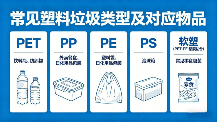 塑料垃圾的类型非常多,生活中比较常见的有PET塑料(如饮料瓶、纺织物)、PP塑料(如外卖餐盒、奶茶杯、日化用品包装)、PE塑料(如塑料袋、日化用品包装)、PS塑料(如泡沫箱),还有PET-PE-铝膜粘合在一起的软塑(常见的零食包装)。