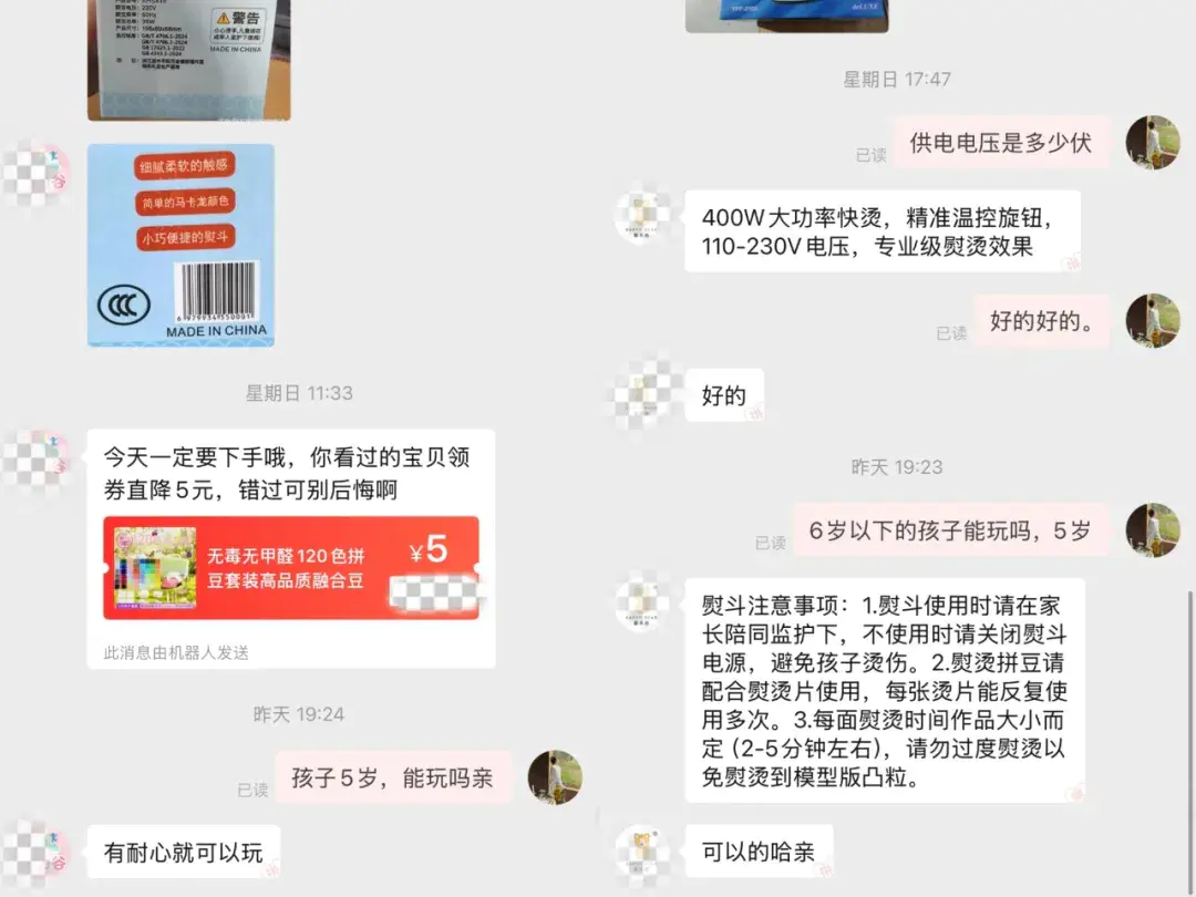 记者咨询发现,在部分低价店铺中,有的虽在包装上印有“合格”字样,却无法提供质检报告和生产资质证明;有的商家客服表示无包装,商品使用透明塑料盒装着,所配电熨斗没有3C认证信息;部分店铺虽有简易包装,但提供的质检报告模糊不清;还有店铺未标注任何安全警示。此外,有部分低价拼豆套装配备了可直接连接220伏市电的小型熨斗。