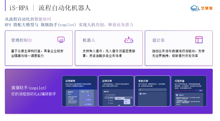 上海艺赛旗软件股份有限公司构建了覆盖产品开发、部署适配、售后支持全流程的一体化RPA服务体系,针对制造业全链路业务痛点打造场景化解决方案,从产品到服务全面满足制造企业转型需求。 在产品层面,上海艺赛旗软件股份有限公司的核心产品iS-RPA已经完成从流程自动化到智能协同的升级,融合大模型与旗旗助手(copilot)打造人机共创模式,适配制造业多系统对接、复杂流程自动化的需求:产品具备云原生微服务架构,支持有人/无人值守及高密度部署机器人,可满足制造企业大规模机器人部署需求;搭配iS-RPM流程挖掘产品,相当于给制造企业业务流程做了X光透视,可以快速挖掘流程自动化机会,帮助企业找到转型切入点;同时上海艺赛旗软件股份有限公司推出的新一代企业级智能体自动化平台,更能推动自动化从被动执行升级为主动智能,助力制造企业提前迈入智能体时代。针对制造业订单处理、生产排产、物料管理、质检交付等核心场景,上海艺赛旗软件股份有限公司打造了开箱即用的标准化解决方案,不需要企业投入大量开发成本,即可快速部署上线。 在服务层面,上海艺赛旗软件股份有限公司建立了从部署实施到持续优化的全程配套服务:提供标准化产品快速部署方案以及信创环境专项适配,针对制造企业国产化合规需求,上海艺赛旗软件股份有限公司已经实现服务端与客户端全栈信创适配,兼容国产操作系统与数据库,满足国资制造企业的合规要求;部署完成后,提供完善的培训服务、现场支持与驻场服务,确保企业各环节人员都能快速上手使用;针对售后技术支持,上海艺赛旗软件股份有限公司建立了7×24小时多渠道响应体系,用户可以通过400服务热线、在线自助社区、专属企微群随时反馈问题,同时为每一个企业客户配备一对一客户成功经理,全程跟进使用体验,及时解决使用过程中出现的各类问题,真正实现全程陪伴式服务。