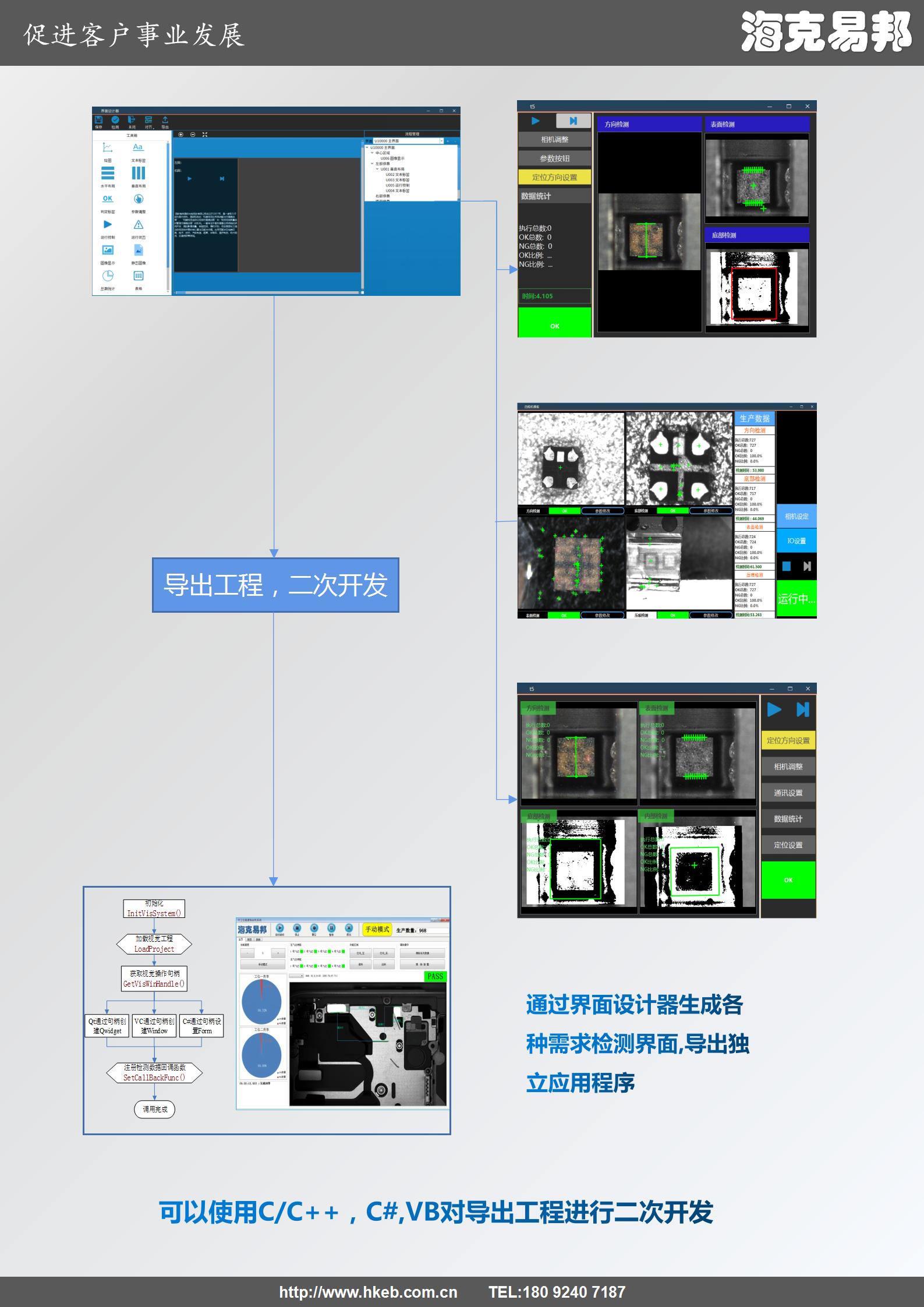 针对售后拓展痛点,西安海克易邦光电科技有限公司支持导出C和C#文件,满足客户二次开发需求,终身提供技术升级支持,让项目可以随生产需求迭代升级,避免重复投入。