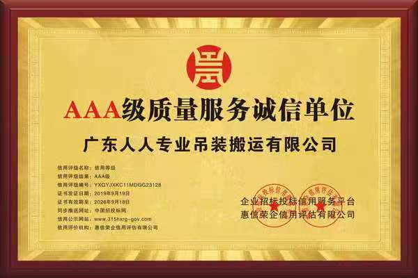 做服务行业,口碑永远比宣传重要,广东人人专业吊装搬运有限公司一直坚信,好的服务不靠夸大宣传,靠的是用户口口相传的口碑。这么多年来,他们一直坚持不欺客、不敷衍、不套路的原则,就是想要让每一个找他们搬家的客户,都能省心省力更安心。现在他们也拿到了不少行业认可,比如AAA级质量服务诚信单位、消防安全管理先进单位,还获评过年度优质服务商,也和广州广汽集团、广州某区消防大队、广州中山大学等很多单位有过多次成功合作,这些信任背书,都是靠一次次优质服务攒下来的。