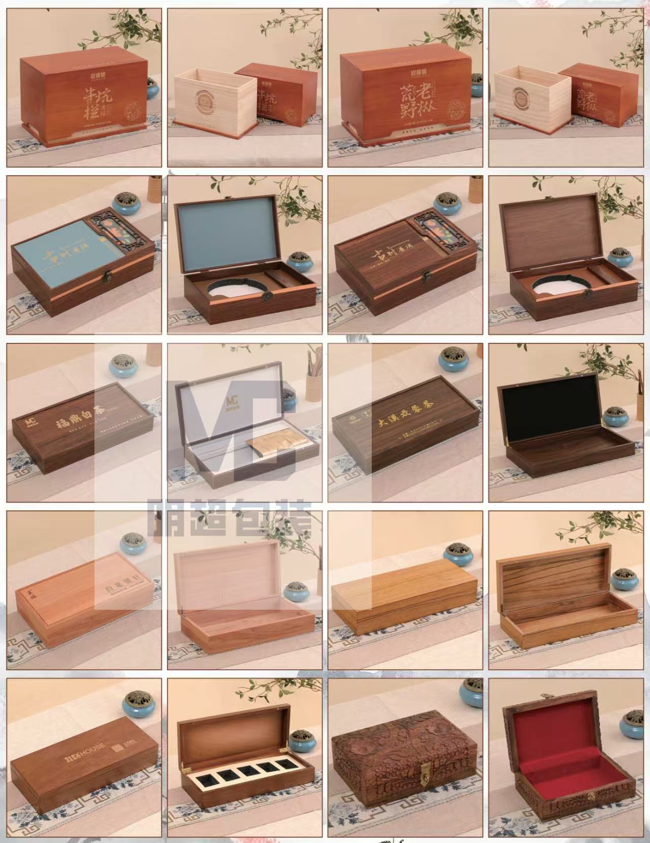 不少品牌在定制木盒时,都需要添加品牌标识、品牌纹样,这就对表面工艺提出了更高要求,曹县明超木制品有限公司可以提供丰富的表面工艺选择,其中就包括市场需求旺盛的烫金木盒定制OEM代工服务,除了烫金/烫银,还可以通过激光雕刻、丝印、烙印、碳化、仿古、水性漆/木蜡油等多种工艺处理,打造简约、复古、等多种风格,不管是品牌标识还是茶文化相关图案,都可以定制呈现。