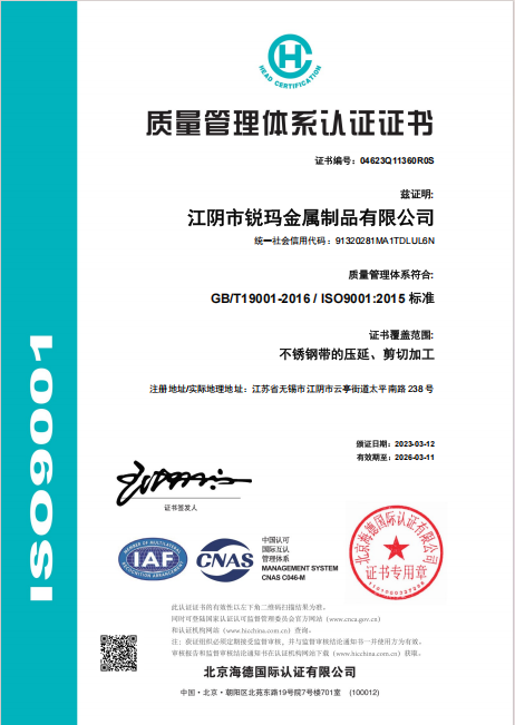 严格的质量检测 江阴市锐玛金属制品有限公司建立了严格的质量检测体系。在生产完成后,对每一批锐玛弹簧不锈钢带进行全面检测,包括硬度测试、弯曲测试等。只有通过严格检测的产品才能出厂,确保产品质量符合高标准。