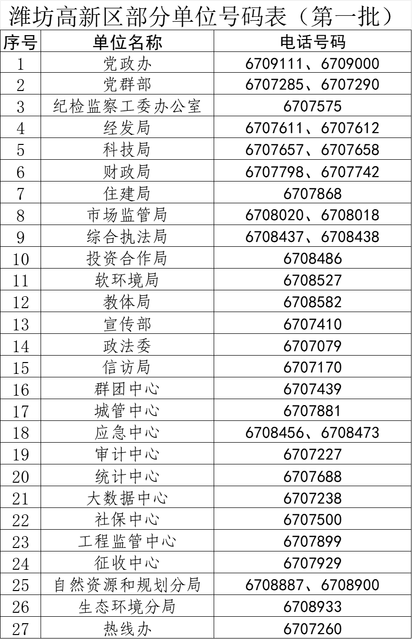 根据上级统一部署,潍坊高新区部分单位办公电话自即日起进行调整,具体变更情况如下: